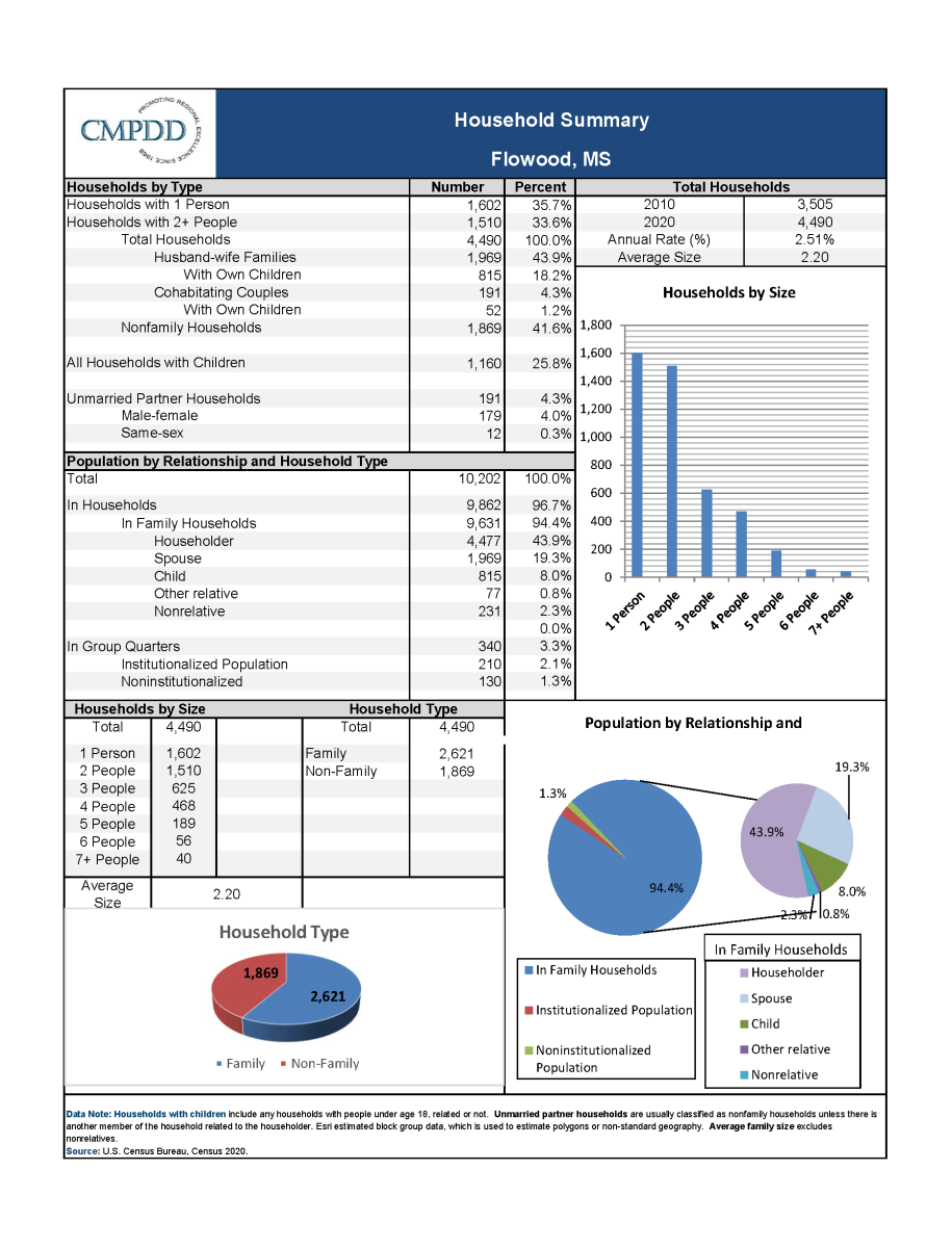 As of the 2020 census, Flowood had a population of 10,202. The population density was 354.3 people per square mile (106.2/km²). The racial makeup of the city was 65.9% White, 25.7% African American, 0.3% Native American, 4.3% Asian, 0.0% Pacific Islander, and 3.7% from two or more races. Hispanic or Latino of any race were 3.6% of the population.